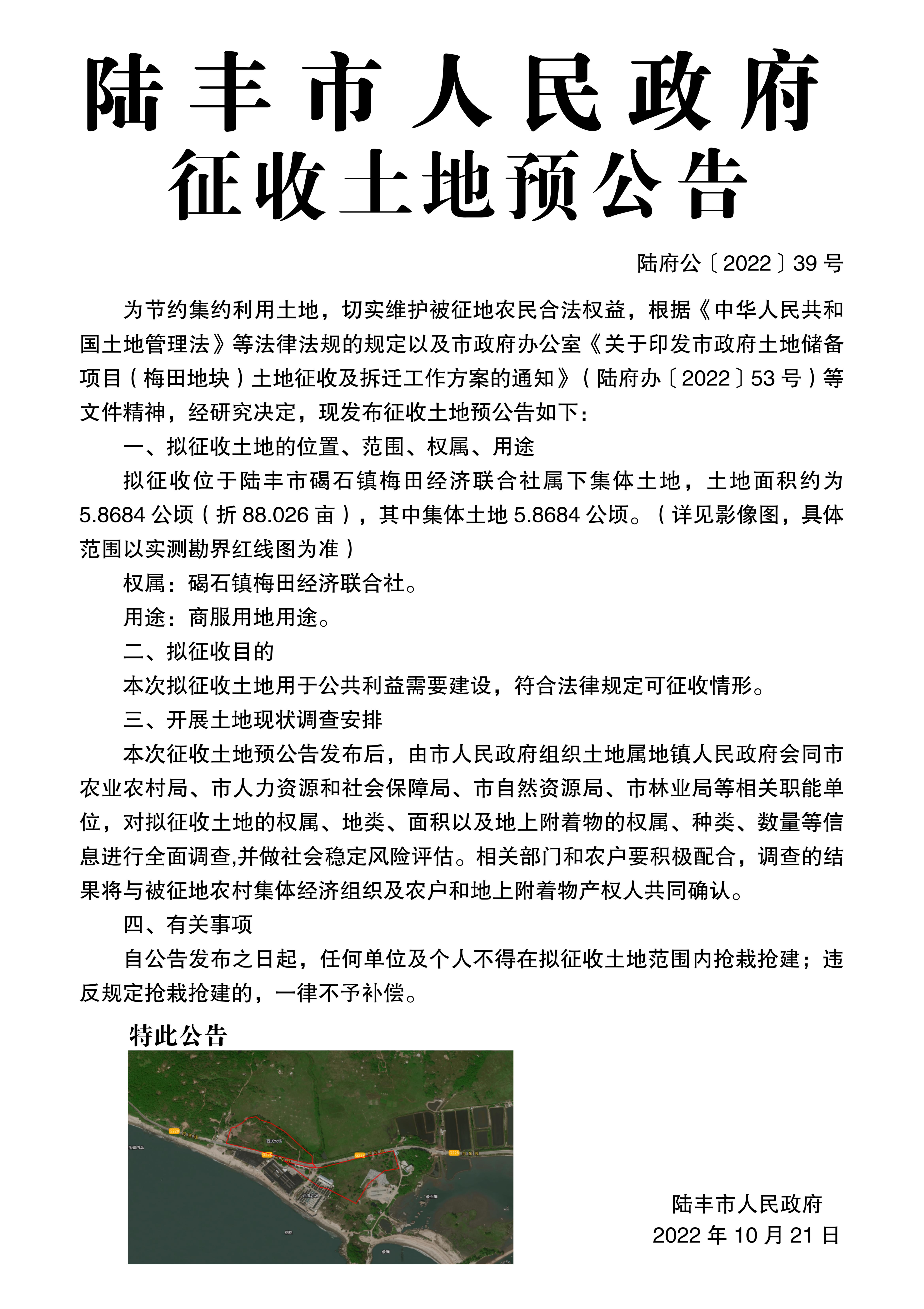 陸豐市人民政府征收土地預(yù)公告(陸府公[2022]39號)