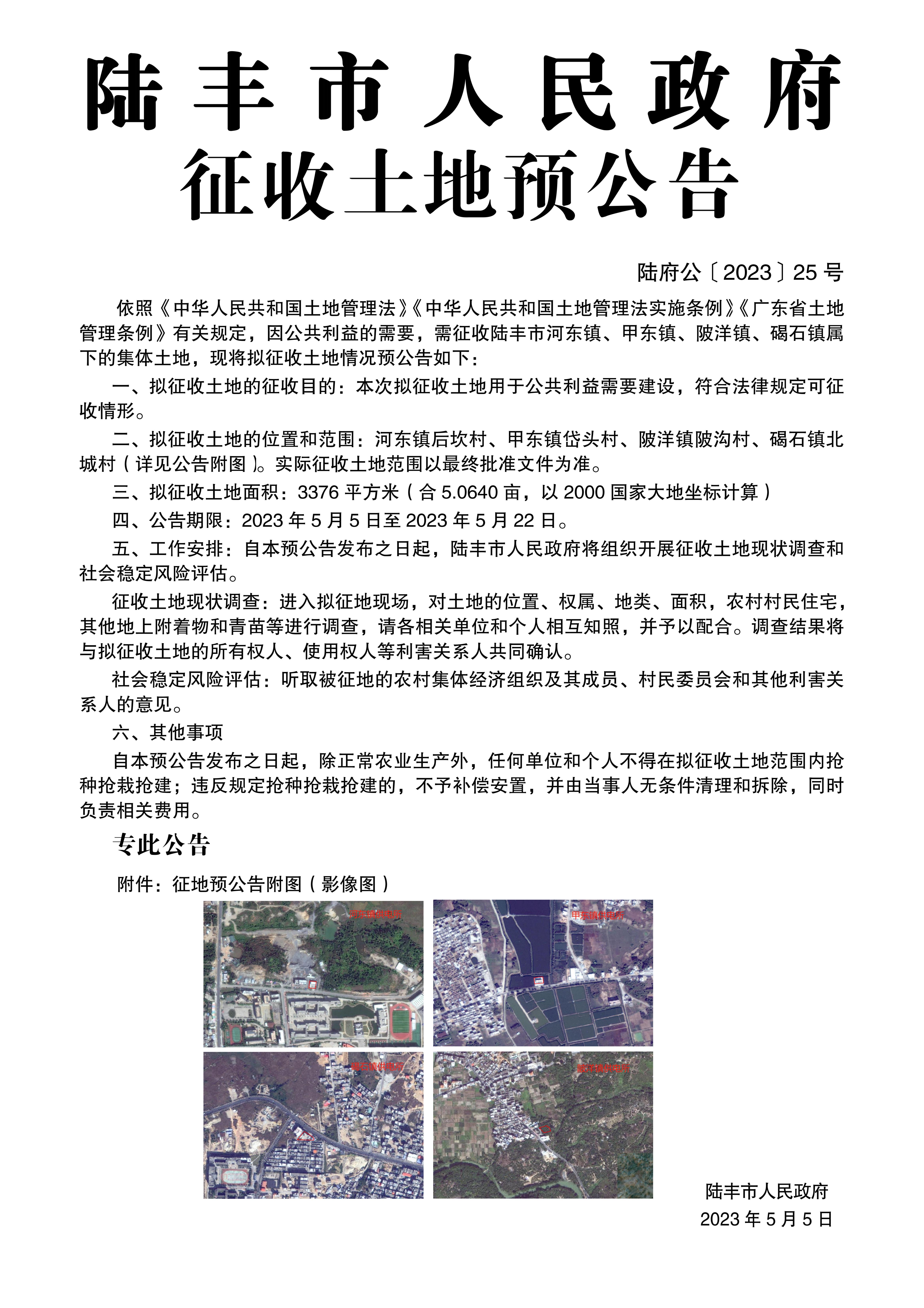 陸豐市人民政府征收土地預公告(陸府公〔2023〕25號)