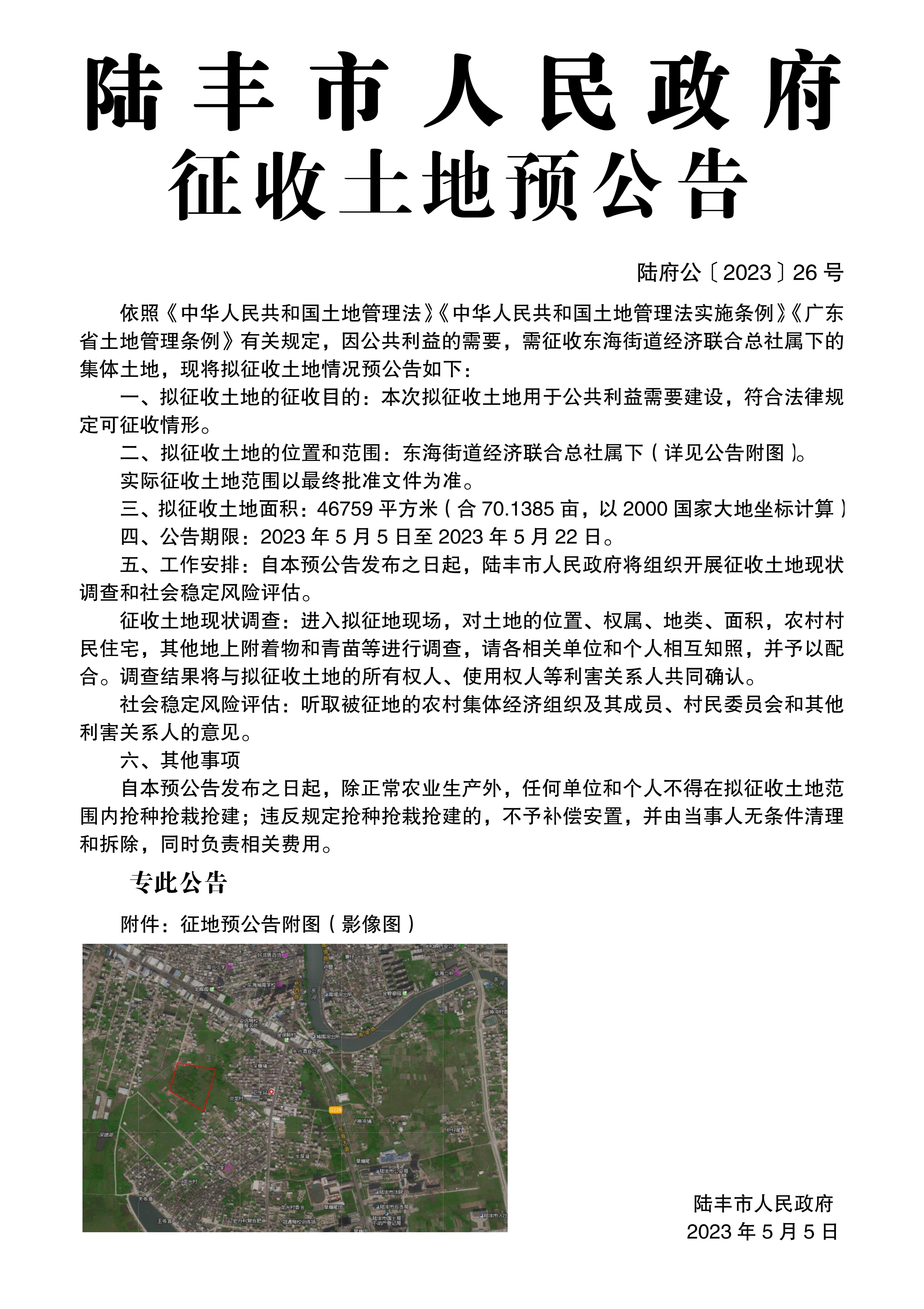 陸豐市人民政府征收土地預(yù)公告(陸府公〔2023〕26號(hào))