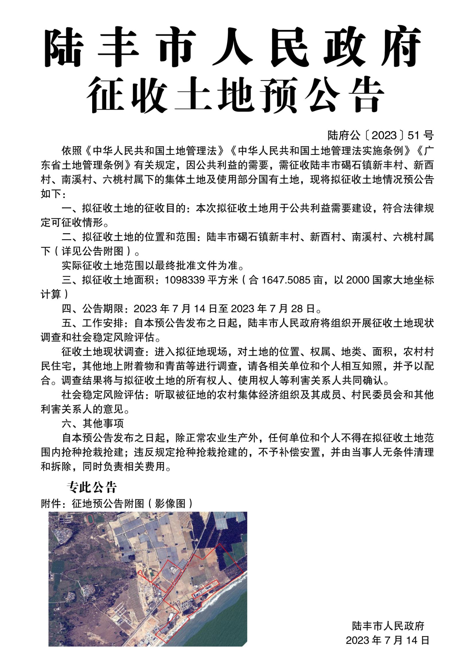 陸豐市人民政府征收土地預(yù)公告(陸府公〔2023〕51號(hào))