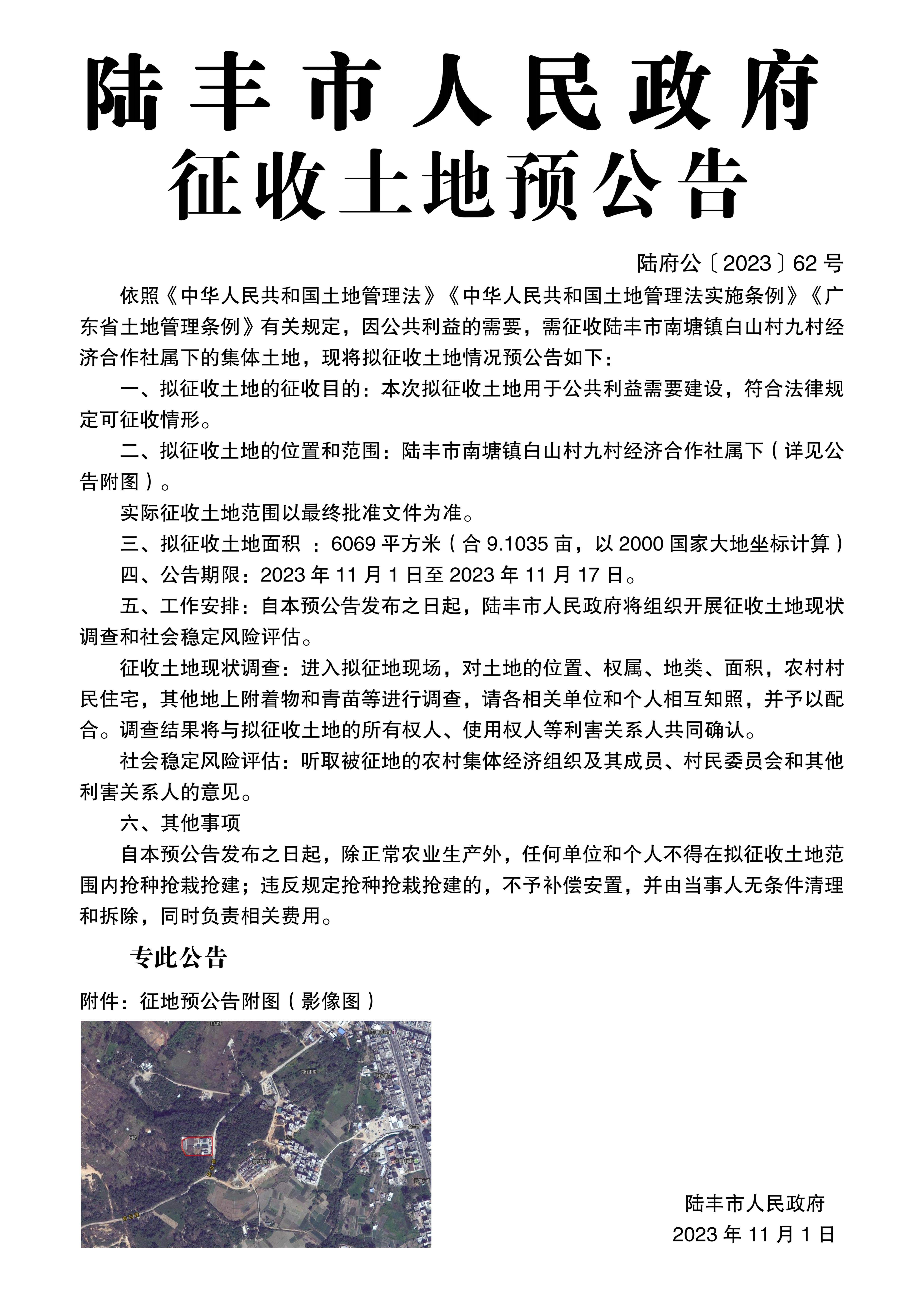 陸豐市人民政府關(guān)于征收土地預(yù)公告(陸府公〔2023〕62號(hào))