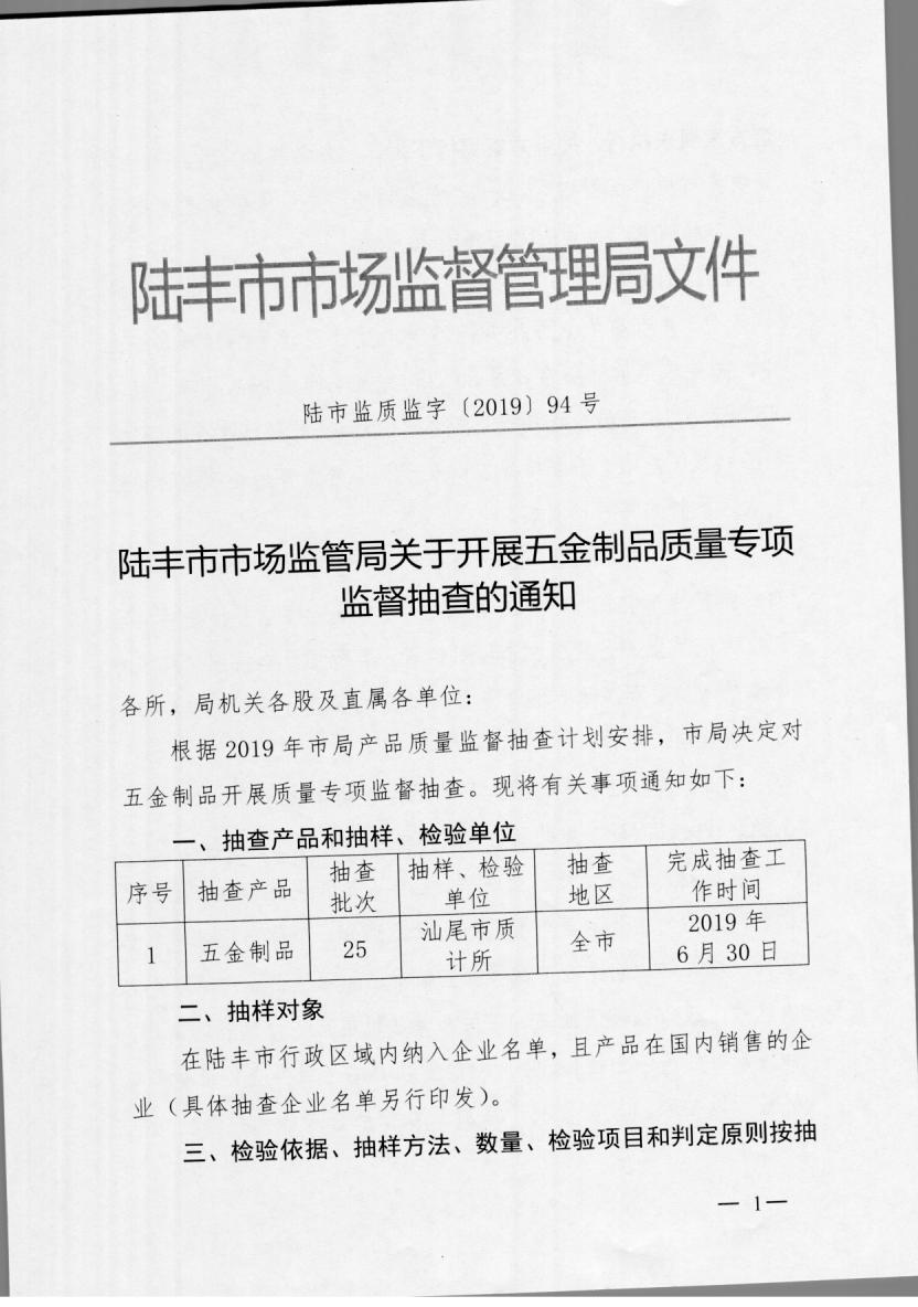 關(guān)于開展五金制品質(zhì)量專項監(jiān)督抽查的通知