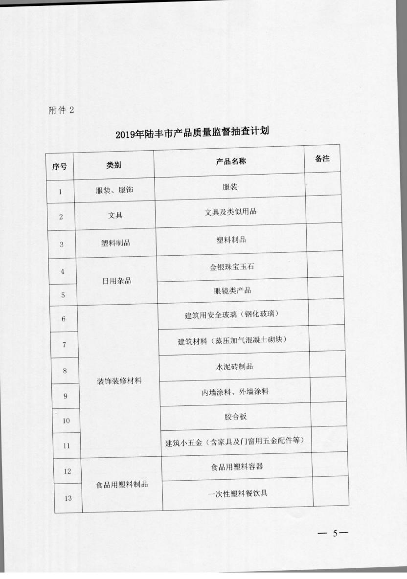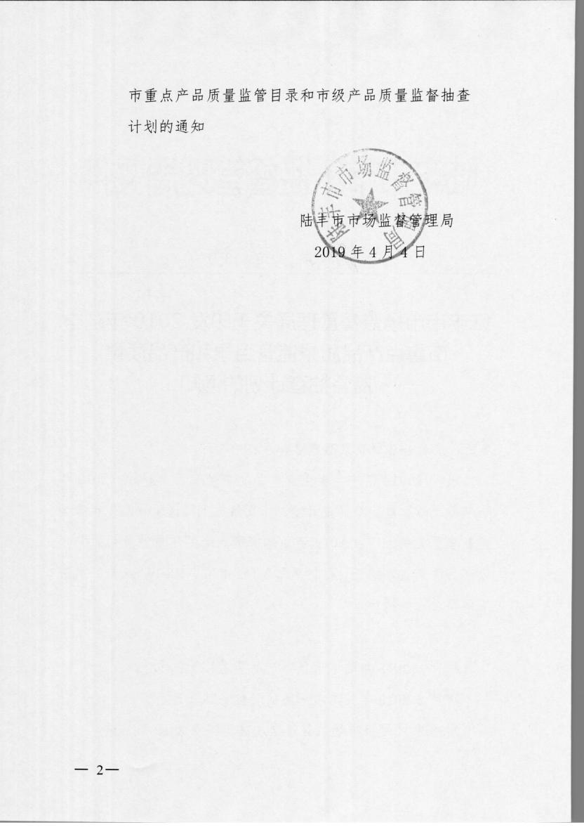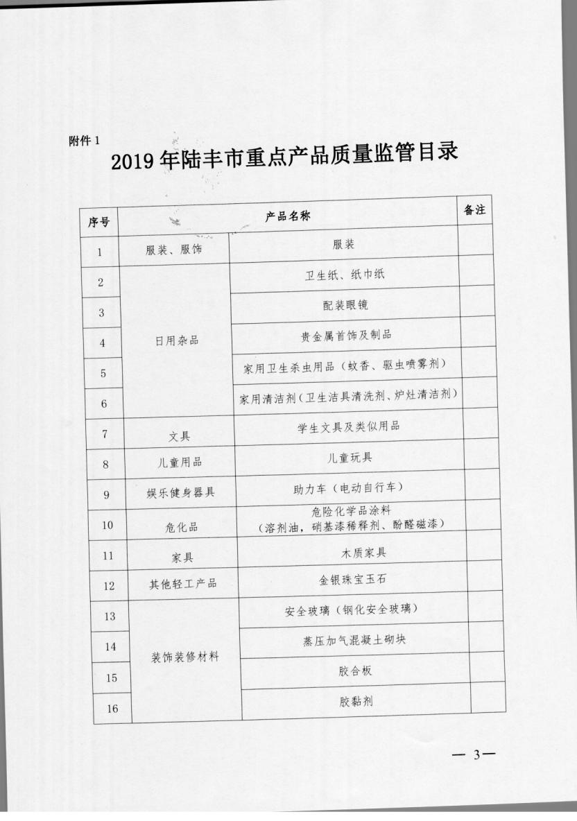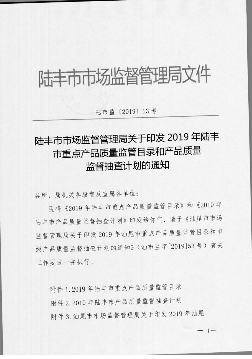 關(guān)于印發(fā)2019年陸豐市重點(diǎn)產(chǎn)品質(zhì)量監(jiān)管目錄和產(chǎn)品質(zhì)量監(jiān)督抽查計(jì)劃的通知