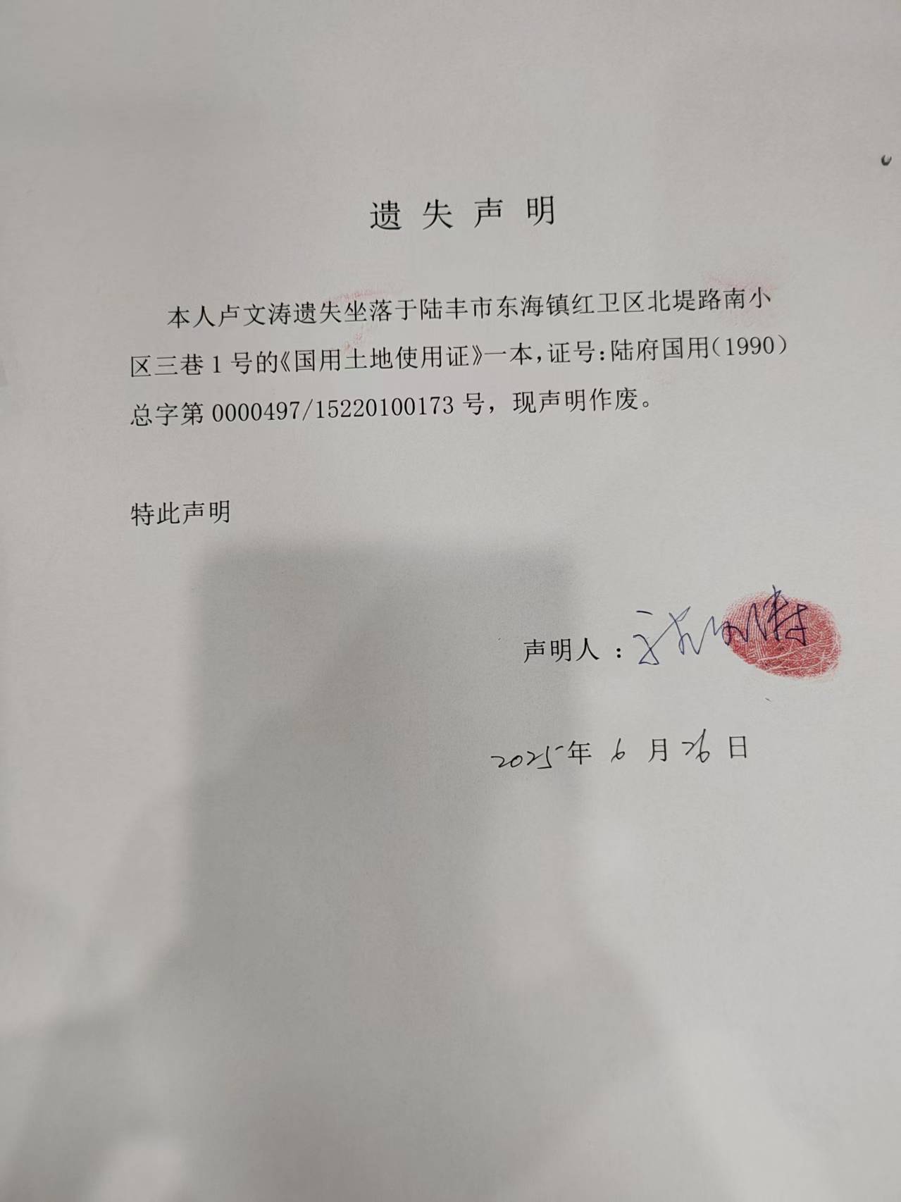 遺失聲明:本人盧文濤遺失坐落于陸豐市東海鎮(zhèn)紅衛(wèi)區(qū)北堤路南小區(qū)三巷1號的《國用土地使用證》一本,證號:陸府國用(1990)總字第0000497/15220100173號,現(xiàn)聲明作廢。