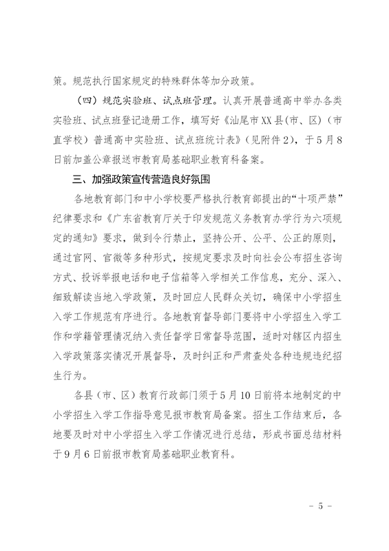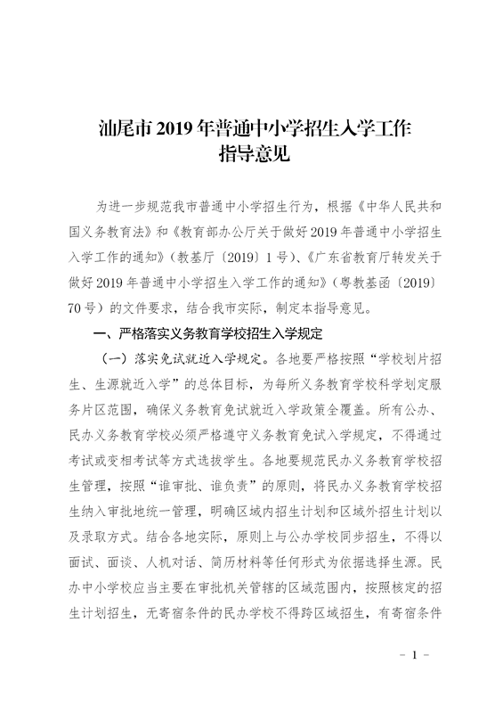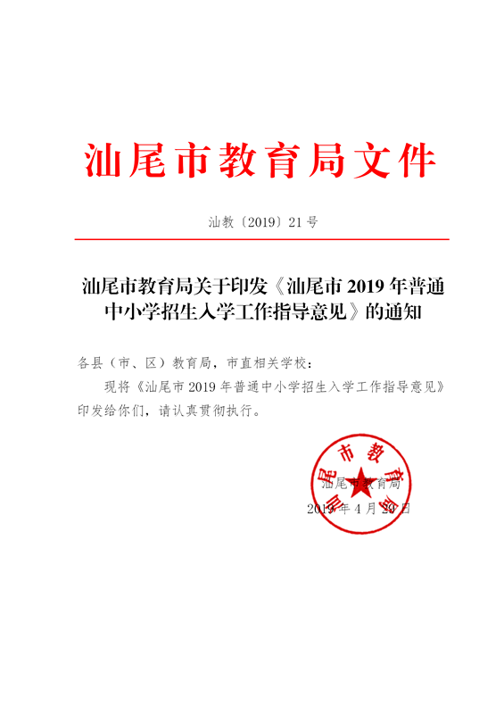 汕尾市教育局關(guān)于印發(fā)《汕尾市2019年普通中小學(xué)招生入學(xué)工作指導(dǎo)意見》的通知